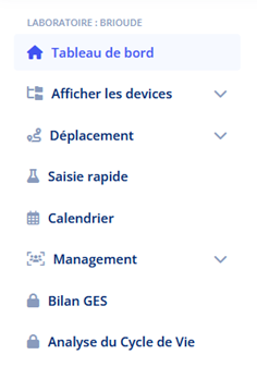 Vous pouvez également gérer vos appareils et relevés en cliquant sur les sous-sections sous « Afficher les devices », gérer vos déplacements en cliquant sur les sous-sections sous « Déplacement » et gérer les accès à différents utilisateurs sur les sous-sections sous « Management ».