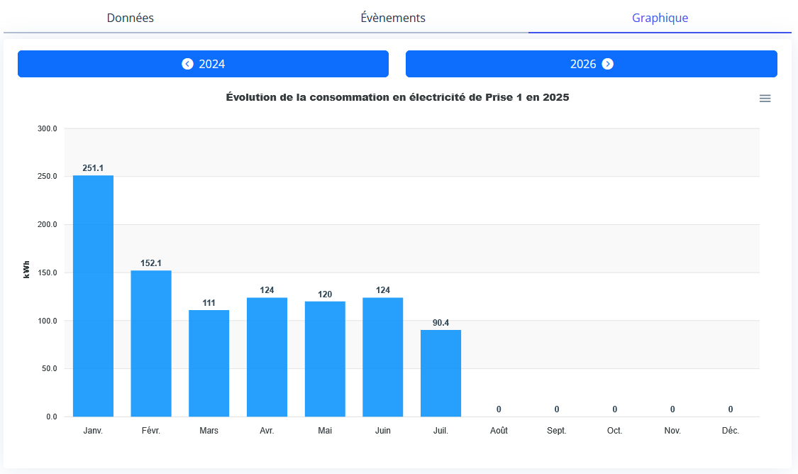 Ce graphique est conçu pour illustrer l’évolution mensuelle des consommations d’une prise spécifique. Il est également possible de revenir sur les consommations des années antérieures en cliquant sur les boutons bleus au-dessus du graphique.