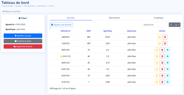 En cliquant sur le dossier « Électricité A » puis sur « Afficher » de la « Prise 1 », vous arrivez sur la page présentée en Figure 8, par défaut sur l’onglet « Données ».