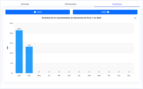 Ce graphique est conçu pour illustrer l’évolution mensuelle des consommations d’une prise spécifique. Il est également possible de revenir sur les consommations des années antérieures en cliquant sur les boutons bleus au-dessus du graphique.