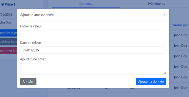 7. Modifiez ou supprimez l'entrée si besoin : une fois la donnée ajoutée, elle apparaît dans la liste des enregistrements associés à cette prise, accompagnée d’options pour modifier ou supprimer l'entrée. Une icône d’information peut également être présente pour des détails supplémentaires.