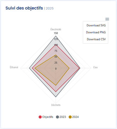 Enfin, la dernière partie du tableau de bord, en bas à droite, inclut une visualisation des consommations sous forme de diagramme en toile d’araignée, qui compare les différentes consommations (électricité, eau, déchets, éthanol) par rapport aux objectifs fixés pour 2025. Ce suivi est essentiel pour permettre aux laboratoires de mesurer leurs progrès par rapport aux années précédentes et d’ajuster leurs actions en conséquence.